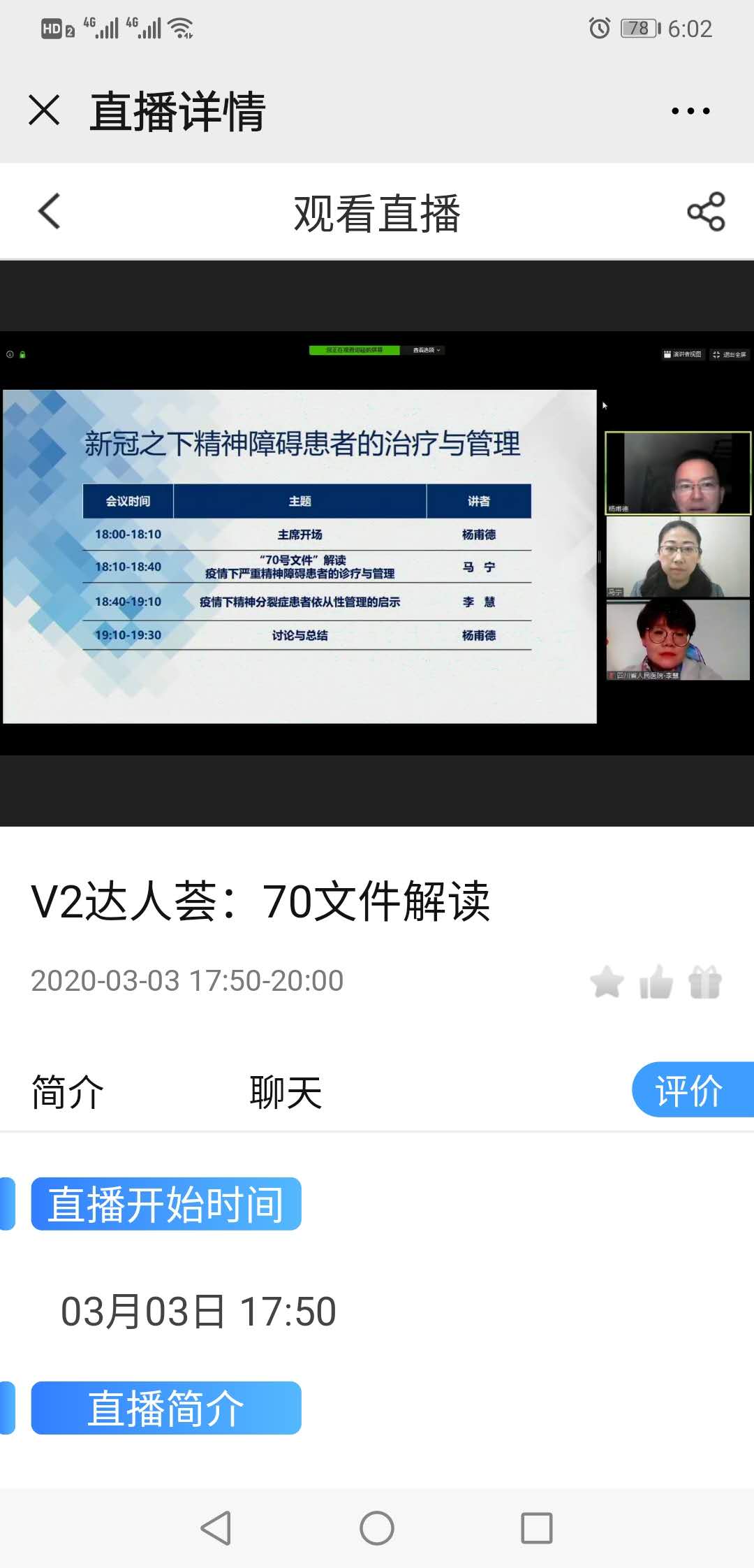 針對當前嚴峻疫情防控形勢,不便集中培訓,為落實省衛健委疫情防控工作督查和市委佘春明書記批示要求,及時傳達上級有關部門通知,進一步做好疫情防控工作,3月3日晚6:00-7:30,醫院組織全體醫護人員利用“醫脈通”視頻直播平臺,參加了中華醫學網組織的新冠肺炎疫情期間精神障礙患者診療與管理培訓會。