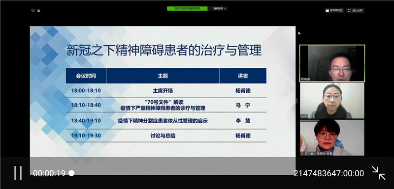 隨后,北京大學第六醫院公共衛生事業部主任馬寧解讀了國務院下發的《關于加強新冠肺炎疫情期間嚴重精神障礙患者治療管理工作的通知》和《關于依法科學精準做好新冠肺炎疫情防控工作的通知》,就精神衛生醫療機構新冠肺炎防控技術方案進行了詳細解讀。四川省精神衛生項目辦副主任李慧講授了《疫情下精神分裂癥患者依從性管理的啟示》。