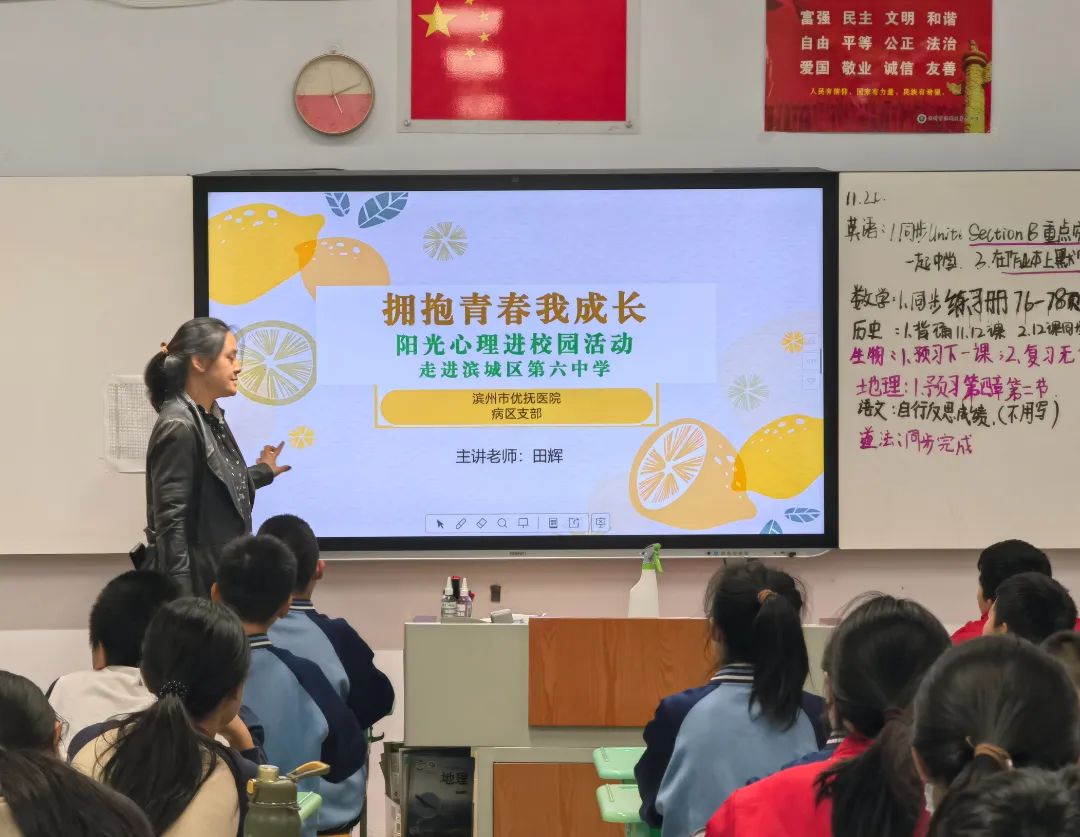 11月20日,濱州市優撫醫院陽光心理志愿服務隊走進濱城區第六中學,舉辦陽光心理“進校園”之病區支部公益大講堂活動,提高青春期學生的心理健康意識和心理調適能力,護航青少年健康成長。
